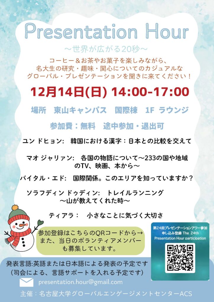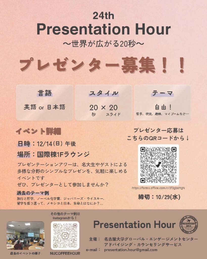 とプレゼンテーションアワー学生チームでは、 24回目になるプレゼンテーションアワーの発表者を募集しています!