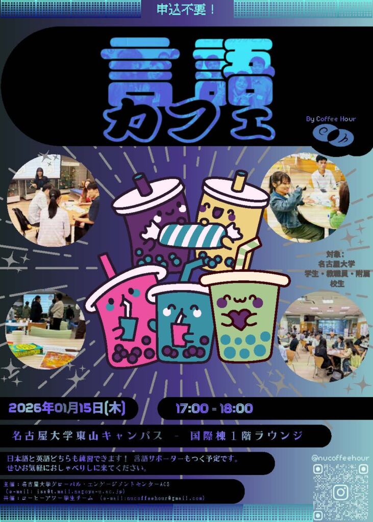 名大生や卒業生の研究・趣味・関心についてのカジュアルなグローバル・プレゼンテーションをコーヒー、お茶、お菓子を楽しみながら、聞きに来ませんか?