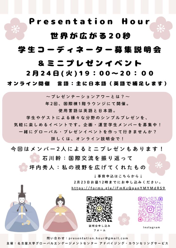 グローバル・エンゲージメントセンター アドバイジング・カウンセリングサービス(ACS)が主催している プレゼンテーションアワー(グローバルプレゼンテーションイベント)では、学生コーディネーターを募集しています!